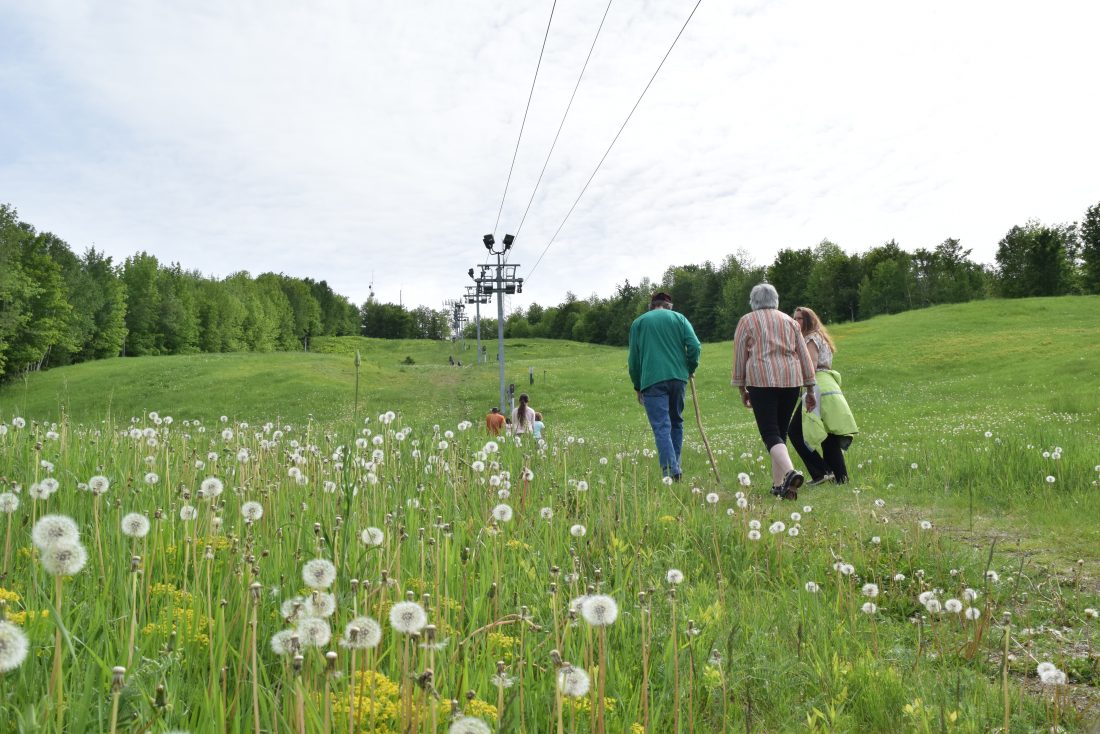 - Members of St. Bernard Catholic Church in Saranac Lake walk up the slope of the village’s Mount Pisgah Ski Area Sunday as the parish celebrated its namesake, St. Bernard of Montjoux, who is the patron saint of hikers. (Enterprise photo — Kevin Shea)