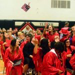 A “Just did it” cap flies through the air over Tupper Lake graduates as they celebrate the end of high school. (Enterprise photo — Aaron Cerbone)