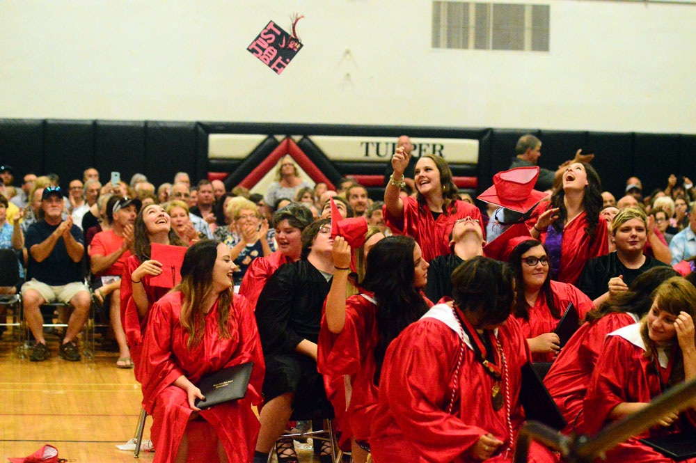 - A “Just did it” cap flies through the air over Tupper Lake graduates as they celebrate the end of high school. (Enterprise photo — Aaron Cerbone)