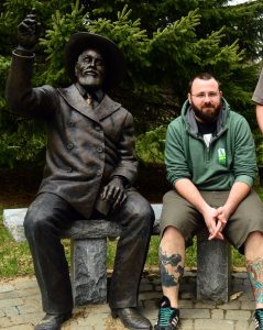 Bryan Giguere sits on a bench beside a statue of Apollos “Paul” Smith. Giguere, a Paul Smith’s College student, was diagnosed with the tick-borne illness babesiosis after a professor told him to get tested for it. (Enterprise photo — Aaron Cerbone)