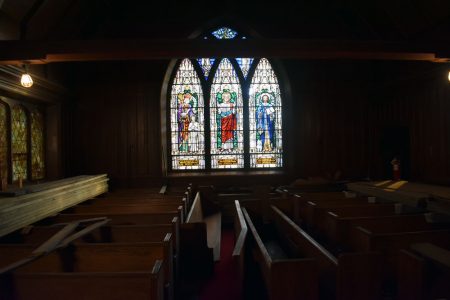 Light enters the Baker Memorial Chapel through a stained-glass window. (Enterprise photo — Griffin Kelly)