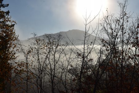 Mount Baker is seen through the fog from AMA Way on the former Trudeau Sanatorium property in Saranac Lake. (Enterprise photo — Griffin Kelly)