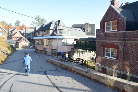 Brian Draper walks down AMA Way as he gives a tour of the former Trudeau Sanatorium. (Enterprise photo — Peter Crowley)