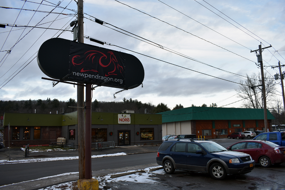 The temporary sign for the future Pendragon Theatre is seen Friday on the corner of Woodruff and Church streets in Saranac Lake. The theater’s new location is expected to open here in 2021. (Enterprise photo — Griffin Kelly)