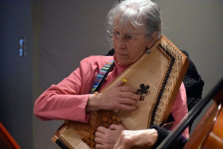 Susan Nolde plays autoharp with Irish folk jam group O’Carolan at TrestleStreet in Saranac Lake Wednesday night.