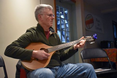 - Tony Munn plays Celtic tunes on a kind of mandolin with the jam group O’Carolan at TrestleStreet in Saranac Lake Wednesday night. (Enterprise photo — Griffin Kelly)