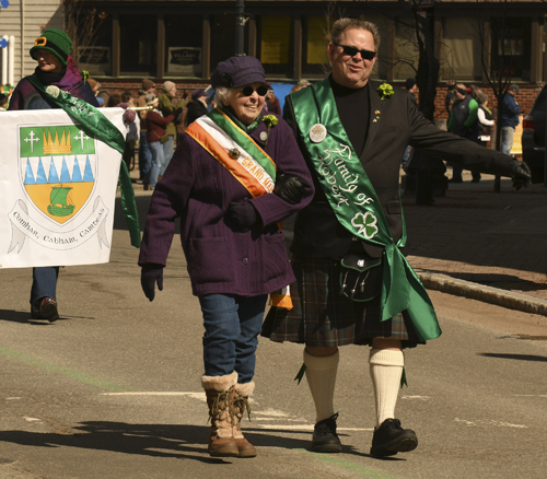 St. Patrick’s Day parade Grand Marshal Pat Finn and her son Kevin Finn soak up the sunshine while marching Saturday in Saranac Lake. (Enterprise photo — Lou Reuter)
