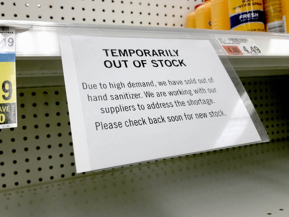 - A sign at the Lake Placid Price Chopper notifies shoppers that hand sanitizer is out of stock. (Enterprise photo — Elizabeth Izzo)