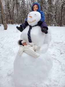 An honorable mention prize in the Say Real Estate snowman contest went to this one helping with daddy day care for Ivy Abrams, sitting on its shoulders, and baby brother Ashton Abrams in Rainbow Lake. Provided photo — Brian Abrams)