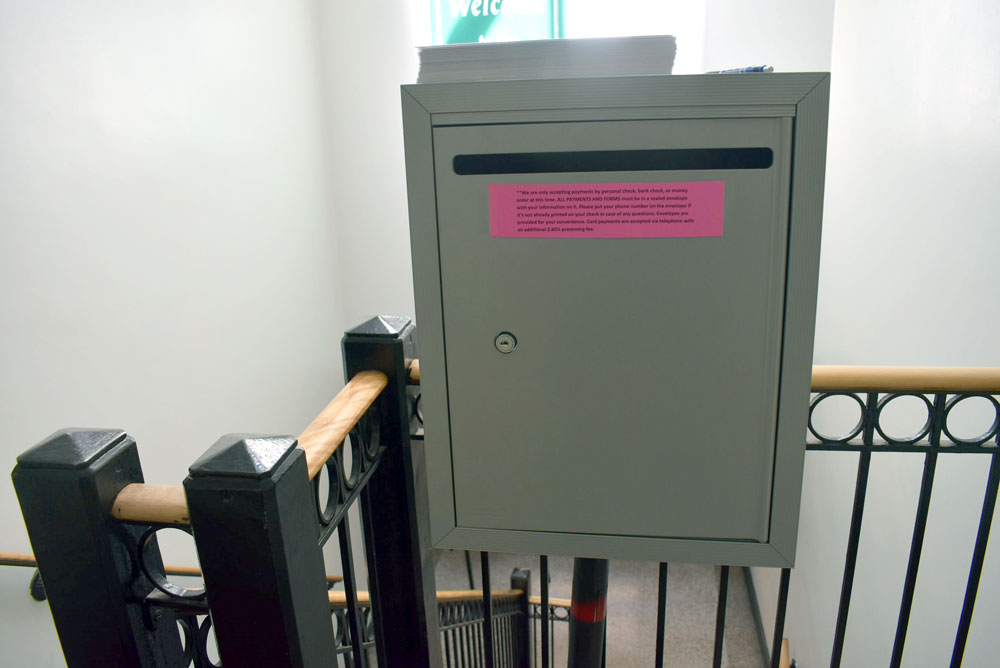 The village of Saranac Lake locked down its office to the public and installed a drop box for bills and other documents. The village offices are located on the second floor of the Harrietstown Town Hall, 39 Main St. (Enterprise photo — Griffin Kelly)