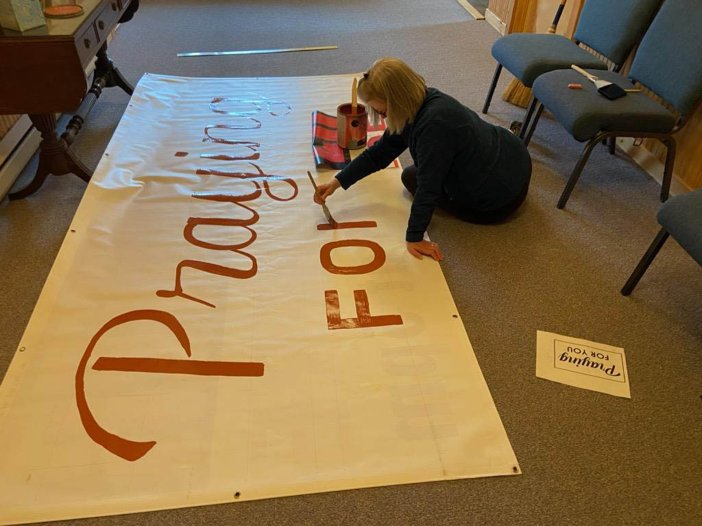 Nancy Koenig paints a sign for the front of the Lake Placid Baptist Church building, which says “Praying for you.” (Enterprise photo — Jim Koenig)