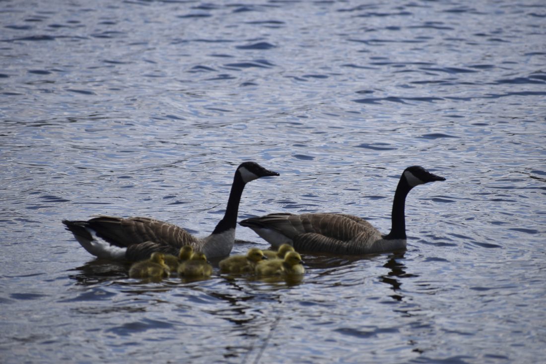 Adult and baby Canada geese swim Wednesday in Lake Flower in the village of Saranac Lake. (Enterprise photo — Elizabeth Izzo)