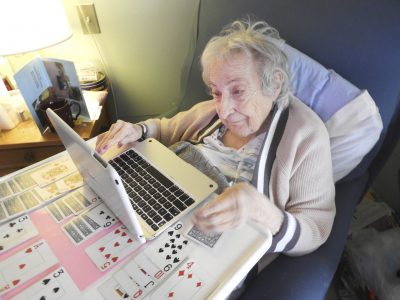 - Josie Perks talks on Skype in her room at Elderwood of Uihlein at Lake Placid. (Photo provided)