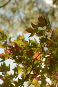 This maple leaves illuminated by sunshine under a stand of pine trees near the shore of Turtle Pond in Saranac Lake are a mix of red and green. (Enterprise photo — Lou Reuter)