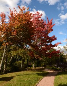 - Maples display their brilliant mix of reds and oranges Friday afternoon along Saranac Lake’s River Walk, which is now fully reopened after construction. (Enterprise photo — Lou Reuter)