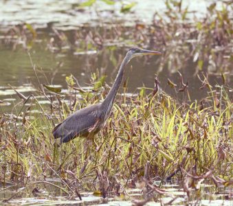 - A great blue heron wades in a patch of withering pickerelweed along the railroad tracks near North Country Community College Friday afternoon. (Enterprise photo — Lou Reuter)