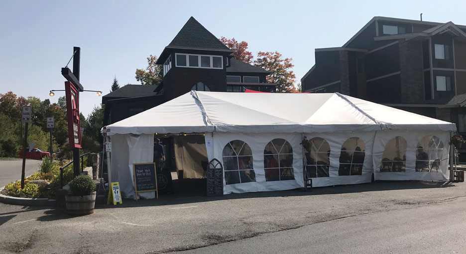 The Lake Placid Pub and Brewery, seen Tuesday with its tent for semi-outdoor dining, is the only local hospitality business that identified itself publicly as having an employee who tested positive for the coronavirus. Four Lake Placid hospitality workers recently tested positive, according to the Essex County Health Department, which did not identify the businesses. (Enterprise photo — Andy Flynn)