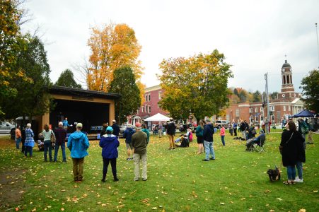 People gather in Riverside Park, Saranac Lake, Saturday at a campaign event for Democratic state Assembly candidate Claudia Braymer and Democratic congressional candidate Tedra Cobb. (Enterprise photo — Aaron Cerbone)