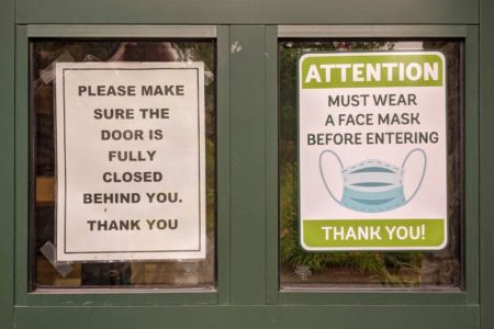 - A mask reminder is seen in a Paul Smith’s College building entrance. (Provided photo — Paul Smith’s College)
