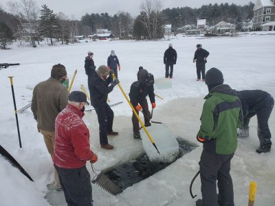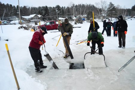 The work started Thursday at around 7:30 a.m. when a few early birds started carrying down the tools of the trade: giant hand saws to cut the ice, long spiked poles to push it along and the big homemade engine-powered saw Garrett Foster cuts the ice blocks with every year on Lake Flower’s Pontiac Bay.