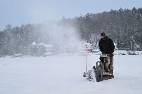 A wet, heavy snow two weeks ago made forming solid ice on Lake Flower difficult. It was too heavy to plow off, and kept accumulating. Though the weather has been cold, new snow insulated was was below, keeping it at a slushy consistency.