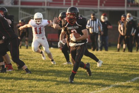 - Playing his final high school football game, Tupper Lake’s Noah Varden finds room to run against Saranac Lake on Friday. (Enterprise photo — Lou Reuter)