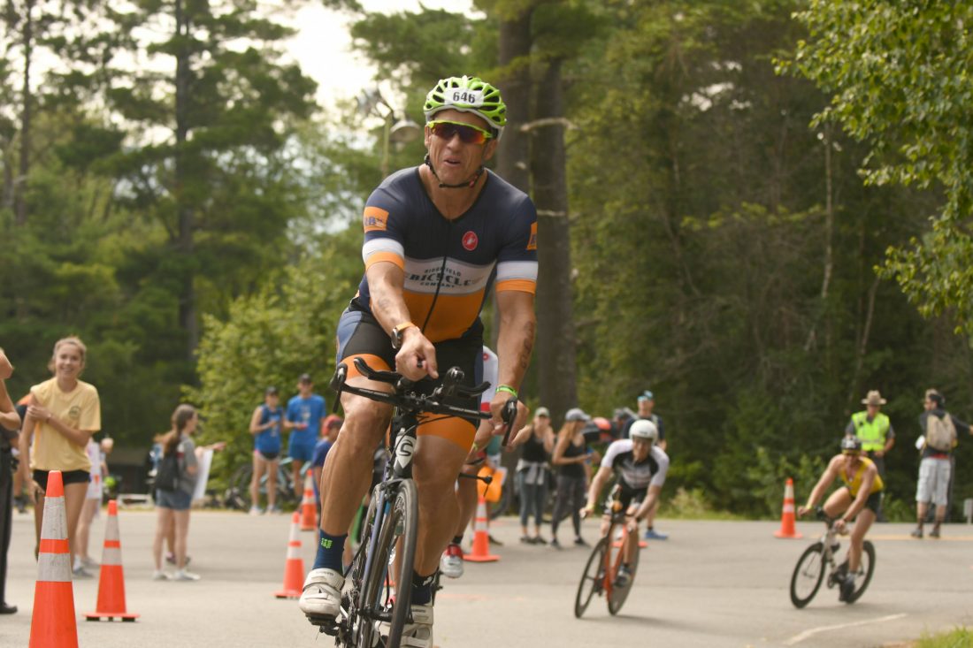 Temporary road closures will take place most of Sunday, July 25 as athletes participate in the annual Ironman Lake Placid triathlon. Above, athletes bike in the 2019 Ironman. (Enterprise photo — Lou Reuter)