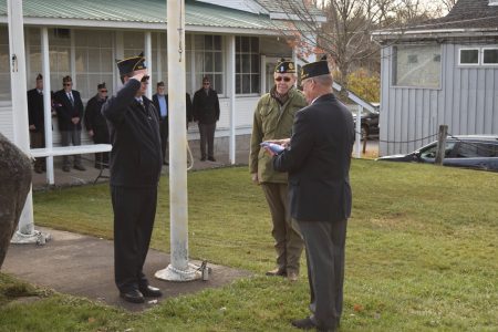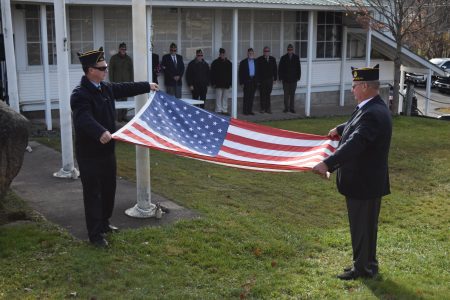 American Legion members held ceremonies at other places in the village and town earlier that day in honor of Veterans Day. They lowered a flag honoring Cyril Levitt and raised a flag honoring Charles Walker at the Adirondack Community Church; at Elderwood of Uihlein Lake Placid, a flag honoring Lawrence Maxwell was lowered and a flag honoring William Dennebaum was raised; a flag honoring William McCalvin at Adirondack Health was lowered and a flag was raised honoring Joel Mayberry; and at the North Elba cemetery, the old flag was lowered and a new flag was raised.