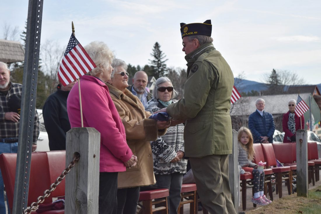 - Doug Hoffman gives a flag honoring veteran Norris “Bucky” Seney to his niece, Kay McCasland, at the American Legion in Lake Placid Thursday. (Enterprise photo — Lauren Yates)