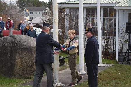 - A local boy scout hands Bob Marvin a new flag to raise at the American Legion in Lake Placid Thursday.