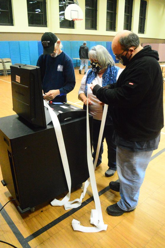 - From left, election workers Mike Larabie, Donna Sloan and Paul LeFebvre check the print-out from a ballot machine in Tupper Lake at the end of election night on Tuesday. (Enterprise photo — Aaron Cerbone)