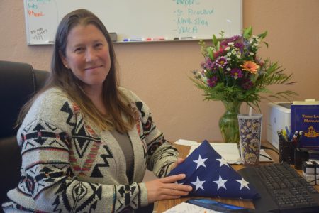 - Harrietstown Supervisor Jordanna Mallach holds the American flag which flew outside her base in Kosovo on the last day of her deployment there. Mallach returned back to town, and the job she was elected to while overseas, earlier this week. (Enterprise photo — Aaron Cerbone)
