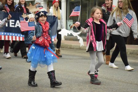 - Kids fly the U.S. flag on Thursday as they parades down Main Street in support of the country’s Olympians. (Enterprise photo — Lauren Yates)