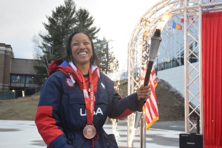 Sylvia Hoffman, who earned a bronze medal in bobsled in the 2022 Beijing Winter Olympics, holds an Olympic torch during the Lake Placid Athlete Parade and Welcome Home Olympians celebration at the Olympic Speedskating Oval. (Enterprise photo — Lauren Yates)