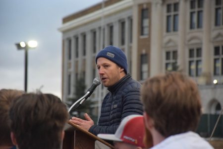 - Billy Demong, a Vermontville native and Olympic medalist in Nordic combined, addresses a crowd at the Olympic Speedskating Oval in March 2022. (Enterprise photo — Lauren Yates)