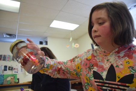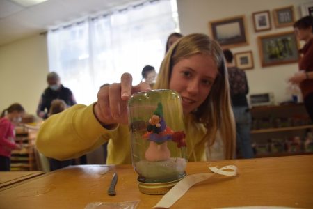 Nina Lawrence, 8, spins the gnome glitter globe she made at ADK ArtRise on Wednesday during a Spring Break art class. She was glad her mom brought her there.
