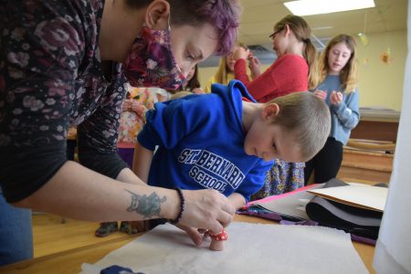 - Brittany Sternberg glues a gnome to a mushroom as Colden Tyler, 6, watches on. Tyler had made the two out of clay at ADK ArtRise on Wednesday during a Spring Break art class. (Enterprise photo — Aaron Cerbone)