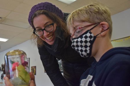- Julia Stone grins big as she looks at the gnome home Oscar Coslovsky, 9, made at ADK ArtRise on Wednesday during a Spring Break art class. “I’ve always found art as a thing that really lets me let out my emotions,” Coslovsky said. Other parents there commented on how “meticulous” he was in his work. (Enterprise photo — Aaron Cerbone)