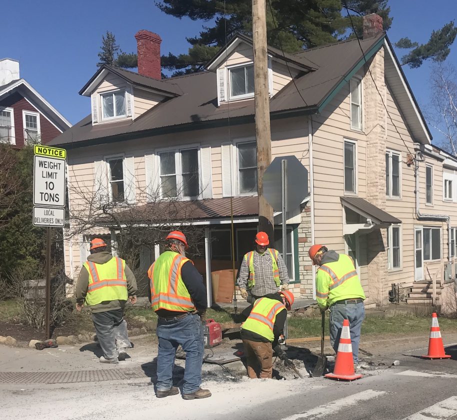 State Department of Transportation workers jackhammer a hole on the corner of Church and Main streets in Saranac Lake on Friday, where the street light has recently been temporarily removed and replaced with stop signs at each corner. DOT spokesman Michael Flick said they are replacing the signal light at that intersection. Because the intersection is so tight, he said one of the new poles has to go where an existing pole is, meaning that existing signal couldn’t be operational while work is taking place. He said the intersection will be controlled as an all-way stop until construction is done. The temporary change drew mixed reviews at a recent village board meeting, with some saying they prefer the stop sign arrangement, and others say they saw cars flying through the intersection in the absence of a stop light, not seeing the stop signs. (Enterprise photo — Andy Flynn)