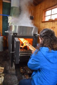 - The Wild Center’s “Shuga Master” Shannon Surdyk fills a maple sap boiler with more wood. The museum’s Community Maple Program, which Surdyk oversees is one of the things Wild Center Executive Director Stephanie Ratcliffe said she’s most proud of. The museum is a finalist for the nation’s highest museum award this year. (Enterprise photo — Aaron Cerbone)