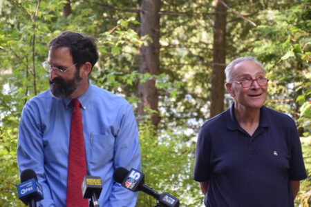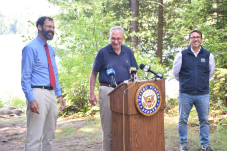 Schumer recalled the acid rains that washed over the Adirondacks as a result of fossil fuel emissions from coal-burning power plants in the midwest, which by 1990 rendered around 700 bodies of water in the Adirondacks “dead” — too acidic to support their native wildlife. Now, Schumer said, life is coming back to those waters. Schumer said that progress was largely a result of amendments made to the Clean Air Act in 1990, and he thought that the IRA could act as a similar “turning point” for the Adirondacks in the face of a warming climate.