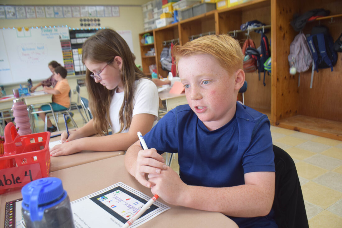 Andrew Varner works on a name card with things he did over the summer for his first day back in school at Carol MacDonald-Schmidt’s fifth-grade class at Bloomingdale Elementary School on Tuesday. It featured things he did over the summer, such as reading “The Magician’s Nephew” the first of the Chronicles of Narnia book series. Bloomingdale Elementary Principal Bruce VanWeelden said one teacher read “The Lion the Witch and the Wardrobe” for classes in recent years, and kids have been hooked ever since. (Enterprise photo — Aaron Cerbone)