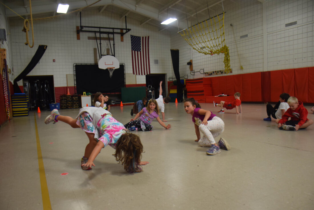 - Adelyn Saddock demonstrates a two-point bridge for Mary Beth Sullivan’s second-grade physical education class at Bloomingdale Elementary School on the first day of the school year, Tuesday. (Enterprise photo — Aaron Cerbone)