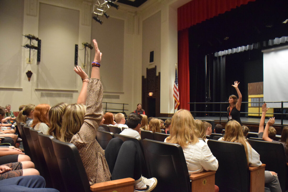 Students’ hands shoot up during a conversation on school expectations Tupper Lake Middle-High Schools’ new principal Amanda Zullo and Director of Student Support Services Trisha Wickwire held on the first day of school on Tuesday. (Enterprise photo — Aaron Cerbone)