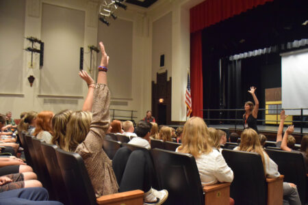 - Students’ hands shoot up during a conversation on school expectations Tupper Lake Middle-High Schools’ new principal Amanda Zullo and Director of Student Support Services Trisha Wickwire held on the first day of school on Tuesday. (Enterprise photo — Aaron Cerbone)