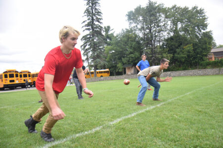 - Luke Robillard hikes the ball while playing a little football in PE at Tupper Lake Middle-High School on the first day of school on Tuesday as Tyler LaPlante takes off running. (Enterprise photos — Aaron Cerbone)
