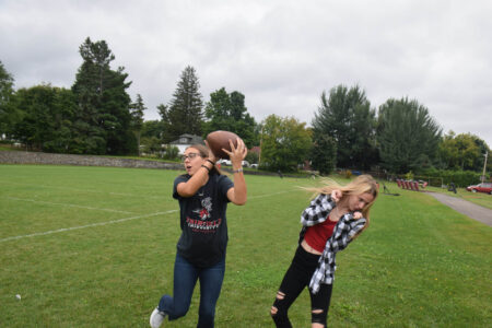 - Abby Smith saves Kelsey Dewyea from getting hit by a football with a clutch catch in PE at Tupper Lake Middle-High School on the first day of school on Tuesday (Enterprise photo — Aaron Cerbone)