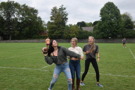 Livia Meade winds up to huck a football to a friend in PE at Tupper Lake Middle-High School on the first day of school on Tuesday as Lauren LaMere and Sarah Higgens watch. (Enterprise photo — Aaron Cerbone)