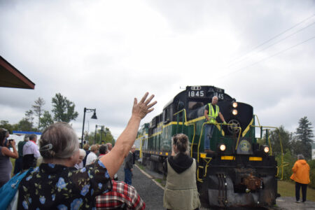 A crowd stood at the Tupper Lake train depot on Tuesday to welcome a locomotive carrying passengers to town with waves, cheers and photos. This inaugural public ride of a Adirondack Railway Preservation Society train on the newly renovated Thendara-Tupper Lake line marks first passenger train on the tracks in many years. In the yellow vests, employees of the companies which renovated the tracks watched the train come in. They said they felt proud of their work seeing all the excited, smiling people greeting the train, a moment they don’t often get to enjoy. The Enterprise will have a full story on the occasion in tomorrow’s paper.