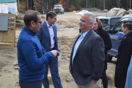 At right, state Assemblyman Matt Simpson, R-Horicon, talks about the Fawn Valley housing development with Pat Fricchione, CEO and general partner at Simplex Homes, at the development on Monday, Oct. 17. Simplex is supplying the modular homes and townhomes for Fawn Valley. Assemblyman Billy Jones, D-Chateaugay Lakes, is seen center. (Enterprise photo — Lauren Yates)